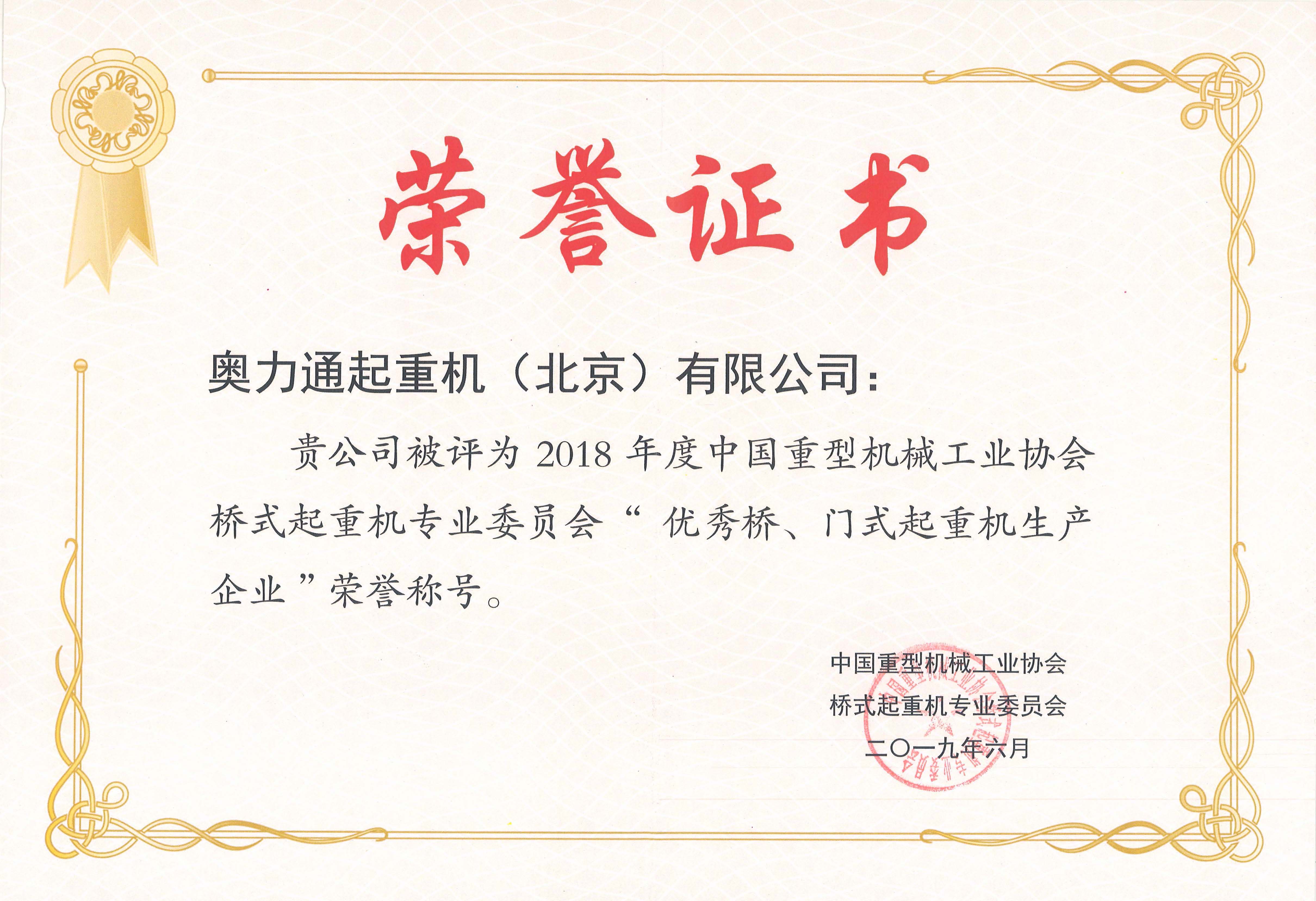 (奧力通榮獲2018年度“優秀橋、門式起重機生產企業”)