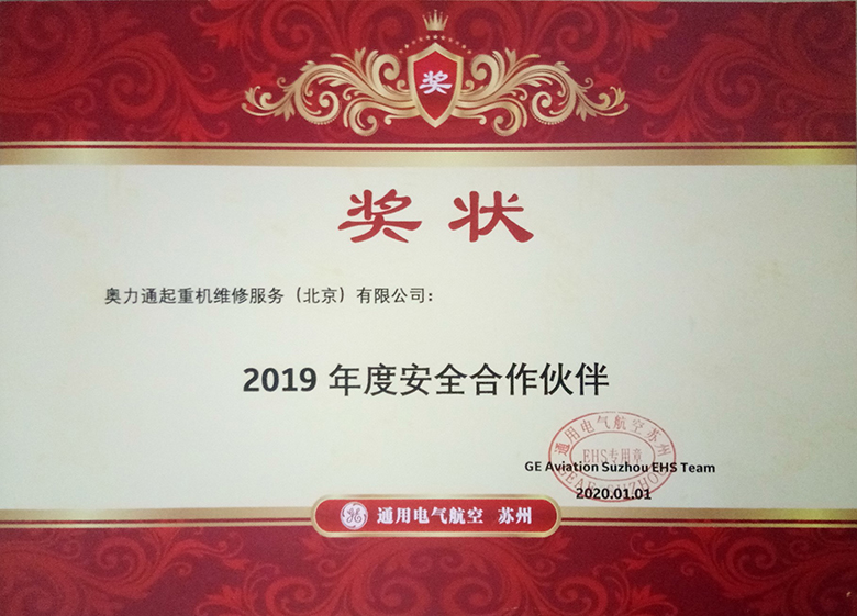 隨著2020年的到來,美好的一年再度啟程;新年伊始,奧力通起重機維保服務團隊收到了合作伙伴通用電氣(GE)航空集團的新年禮物---2019年度安全合作伙伴獎,以此表彰和感謝奧力通維保服務團隊長期以來為通用電氣(GE)航空集團提供的安全、質量、高效的起重機維保服務。