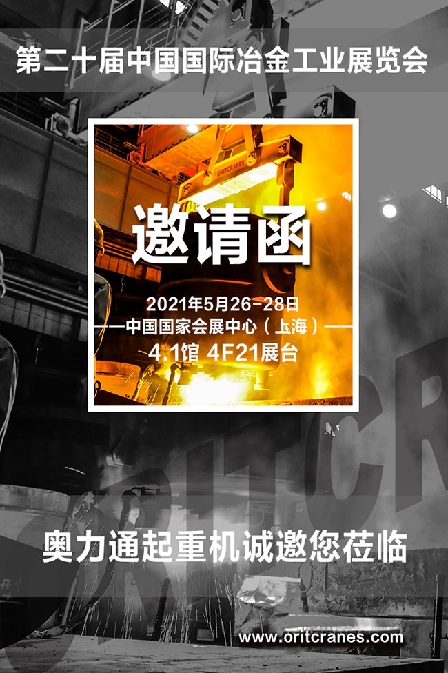 奧力通誠邀您第二十屆中國國際冶金工業(yè)展覽會,上海起重機(jī),冶金起重機(jī),歐式冶金卷揚,鋼包起重機(jī),龍門吊,歐式雙梁橋式起重機(jī),起重設(shè)備,單梁式起重機(jī)廠家,天車起重機(jī),起重機(jī)廠家,起重機(jī)公司,起重設(shè)備生產(chǎn)廠家,防爆單梁起重機(jī)廠家,雙梁橋式起重機(jī)。