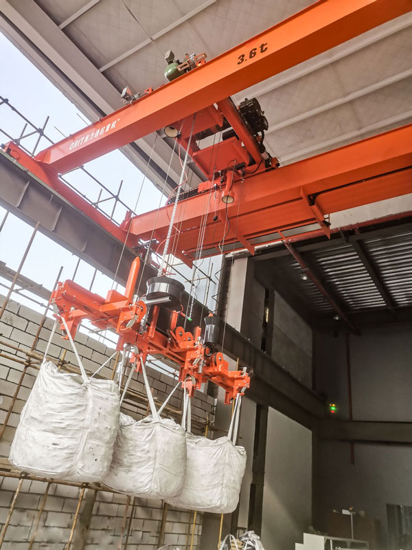 在黨101周年生日慶祝之際,奧力通起重機完成“三袋聯吊”智能噸袋起重機交付,該產品一次可吊運三袋噸袋,自動脫鉤,自動裝車;“三袋聯吊”世界首創,生產效率提升300%,節約人工70%;廣泛應用于食品、化工、礦業、冶煉等粉末狀或顆粒狀物料的噸袋自動裝卸。