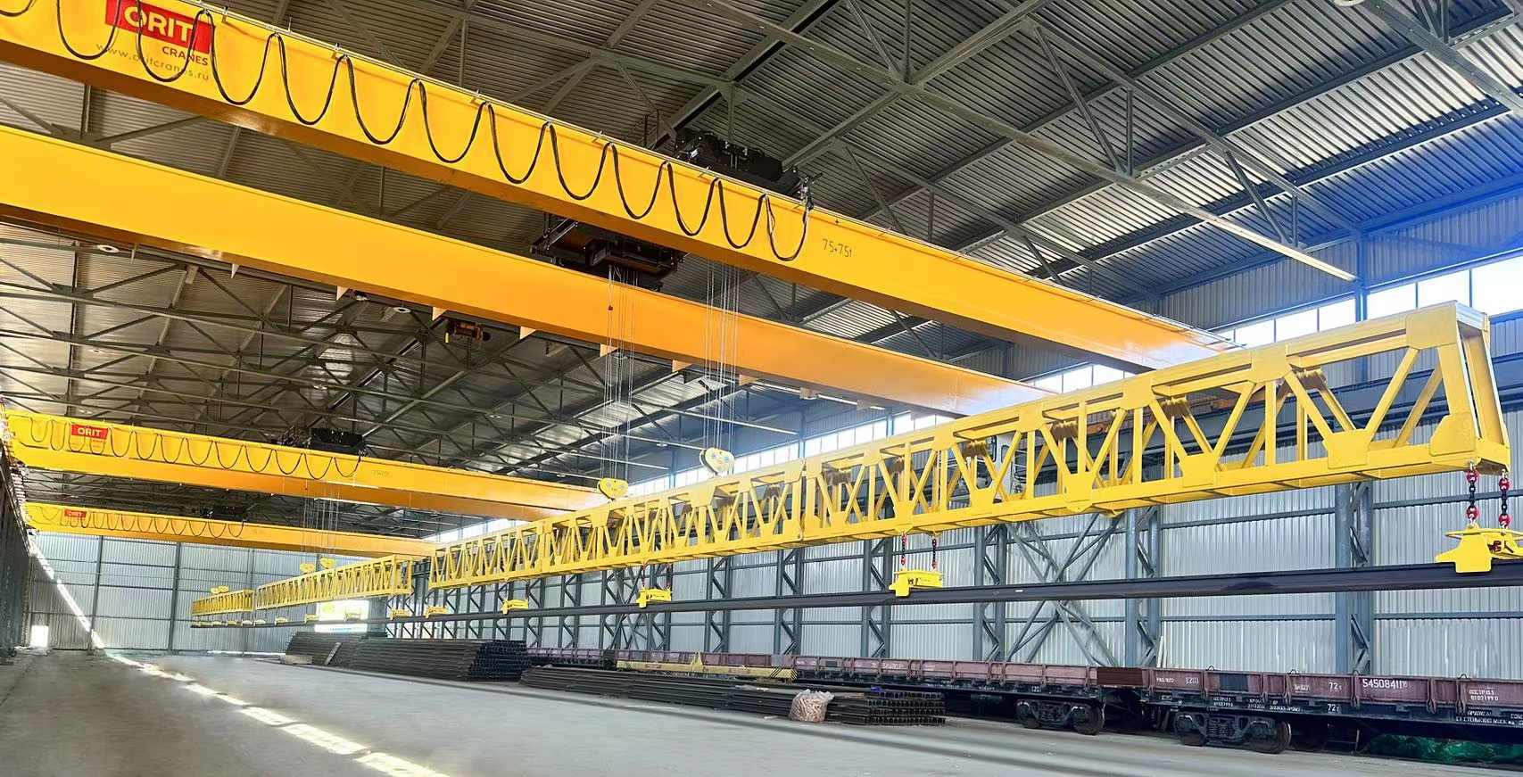 奧力通長軌自動吊,三車聯動定位精度高,一次性起吊多根幾百米長的超長軌道,實現所有鋼軌同步抓取、同步卸貨,作業效率高、用工成本低。
