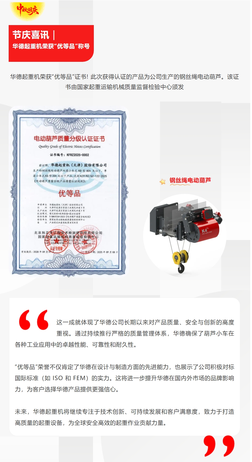 華德起重機(jī)榮獲“優(yōu)等品”認(rèn)證