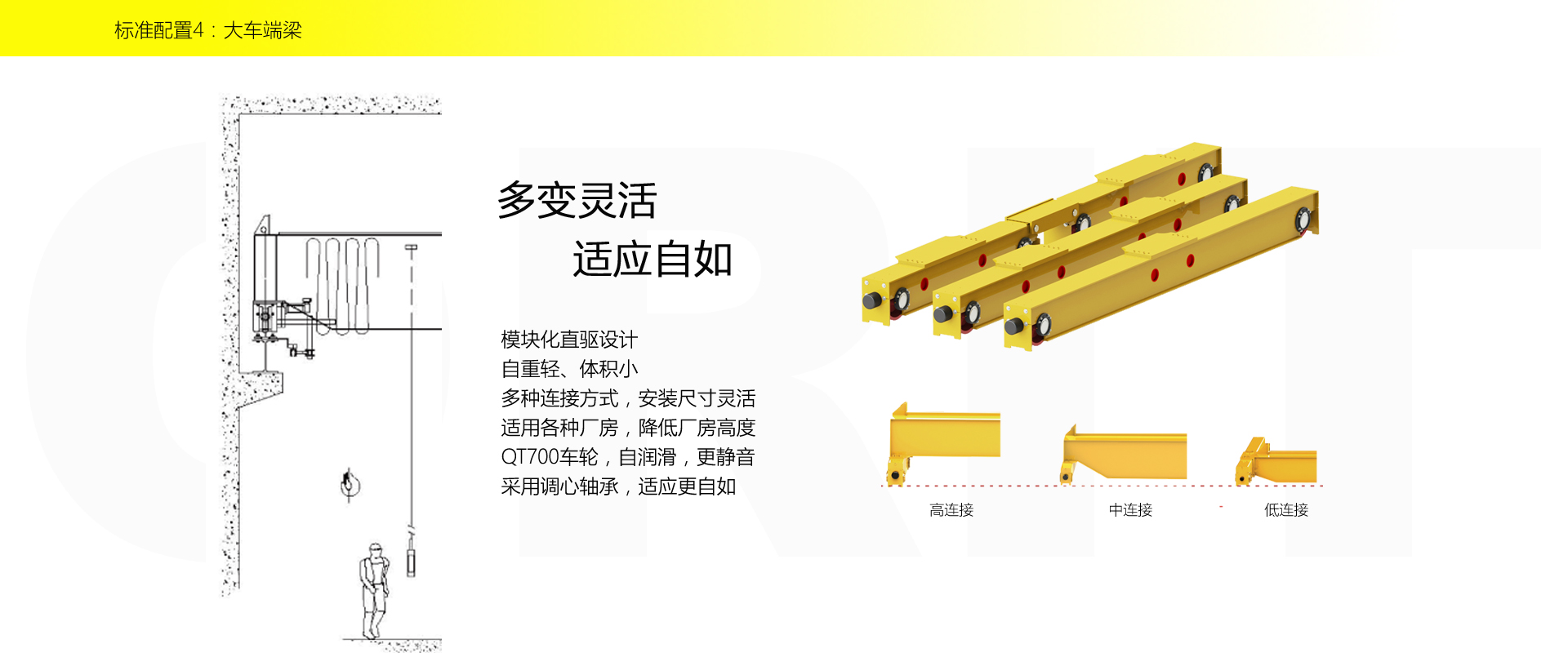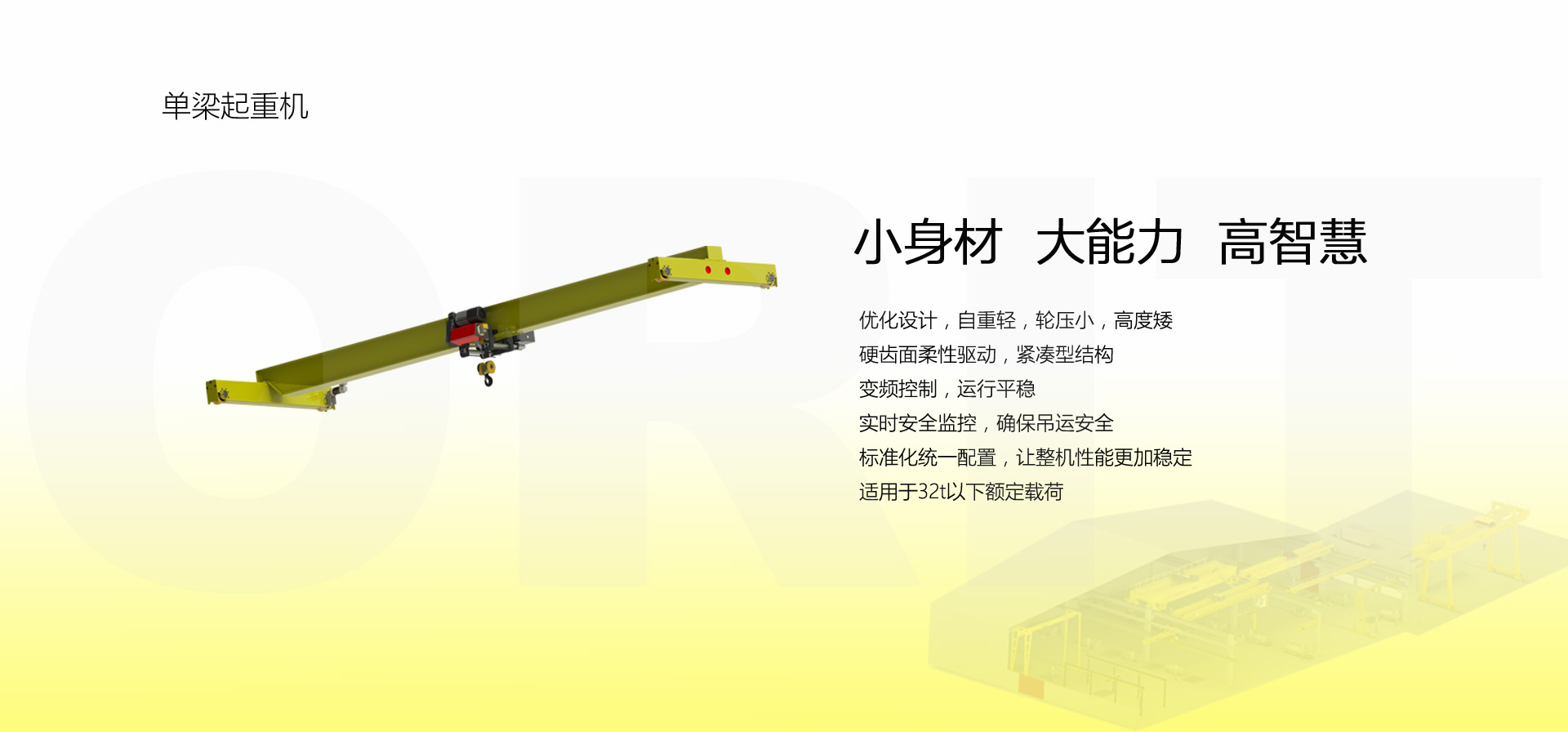 產品名稱:單梁橋式起重機 小身材、大能力、高智慧 優化設計,自重輕,輪壓小,高度矮 硬齒面柔性驅動,緊湊型結構 變頻控制,運行平穩 實時安全監控,確保吊運安全 標準化配置,讓性能無比穩定 適用于32t以下額定載荷 標準配置1:起升機構 顛覆傳統,自成一體 低凈空設計 柔性驅動,內應力小,傳動效率高 重級制電機,接電持續率60%ED 行走變頻無極調速,運行平穩 自調試電磁盤式制動器,可靠,防塵 2160N/mm2 高強度鍍鋅鋼絲繩,免維護 全周型導繩器,防松繩 全系標配安全監控系統 標準配置2:三合一驅動 靜音科技,靜享搬運 結構緊湊,鋁合金殼體,密封 變頻電機+硬齒面減速箱+盤式制動器 三合一集成化設計 全變頻調速 最高轉速4800 r/min 防護等級IP55 半油脂潤滑,免維護 靜音科技,靜享搬運 標準配置3:電控系統 安全隨心掌控 智能安全監控器 計算起升機構剩余安全工作時間 累計起升工作時間 累計超載次數 累計起升電機啟動次數 起升電機過熱保護及報警 剎車片厚度報警 ... ... 遠程通訊 施耐德電氣元件 航空插座接口 IP55防護等級 標準配置4:端梁 多變靈活,適應自如 模塊化直驅設計 自重輕、體積小 多種連接方式,安裝尺寸靈活 適用各種廠房,降低廠房高度 QT700車輪,自潤滑,更靜音 采用調心軸承,適應更自如 應用