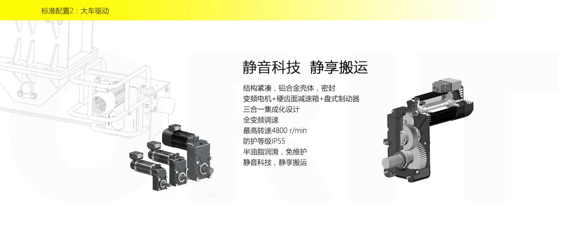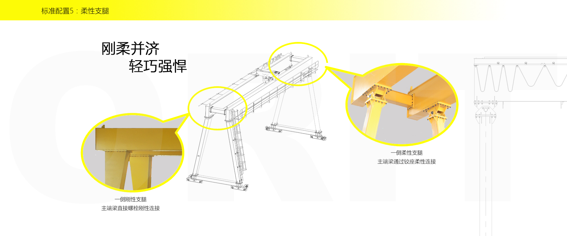 產(chǎn)品名稱:雙梁門式起重機(jī) 剛?cè)岵?jì) 小體積 大能耐 優(yōu)化設(shè)計,結(jié)構(gòu)緊湊 柔性支腿,有效釋放應(yīng)力,延遲結(jié)構(gòu)壽命 柔性支腿,體積小,節(jié)省空間 變頻控制,運(yùn)行平穩(wěn) 實時安全監(jiān)控,確保吊運(yùn)安全 標(biāo)準(zhǔn)化配置,讓性能無比穩(wěn)定 配置K系起升,適用于80t以下額定載荷 無牛腿車間搬運(yùn)的最佳解決方案 配置CM智能卷揚(yáng)起升,適用于500t以下額定載荷起吊 標(biāo)準(zhǔn)配置1-1:起升機(jī)構(gòu) SWL(t) HOL(m) 0.8t-80t Max.90m 低凈空設(shè)計 柔性驅(qū)動,內(nèi)應(yīng)力小,傳動效率高 柔性鉸接小車架 重級制電機(jī),接電持續(xù)率60%ED 行走變頻無極調(diào)速,運(yùn)行平穩(wěn) 自調(diào)試電磁盤式制動器,可靠,防塵 2160N/mm2 高強(qiáng)度鍍鋅鋼絲繩,免維護(hù) 全周型導(dǎo)繩器,防松繩 全系標(biāo)配安全監(jiān)控系統(tǒng) 標(biāo)準(zhǔn)配置1-2:起升機(jī)構(gòu) 顛覆傳統(tǒng),自成一體 SWL(t) HOL(m) 5-500t Max.160m 歐式智能卷揚(yáng) 高度矮,自重輕,節(jié)約建筑成本 重級制,滿足持續(xù)重載作業(yè) 柔性驅(qū)動,內(nèi)應(yīng)力小,傳動效率高 免維護(hù) 適配各種吊具 智能化:寸動/微動/電子防搖 故障自診斷系統(tǒng)及HMI 標(biāo)準(zhǔn)配置2:三合一驅(qū)動 靜音科技,靜享搬運(yùn) 結(jié)構(gòu)緊湊,鋁合金殼體,密封 變頻電機(jī)+硬齒面減速箱+盤式制動器 三合一集成化設(shè)計 全變頻調(diào)速 最高轉(zhuǎn)速4800 r/min 防護(hù)等級IP55 半油脂潤滑,免維護(hù) 靜音科技,靜享搬運(yùn) 標(biāo)準(zhǔn)配置3:電控系統(tǒng) 安全隨心掌控 互聯(lián)網(wǎng)+ HIM人機(jī)交互界面 無線遠(yuǎn)程控制 物聯(lián)網(wǎng)遠(yuǎn)程管理 4G移動通訊 遠(yuǎn)程診斷系統(tǒng) 信息系統(tǒng) 自動化 速度擴(kuò)展功能 電子防搖功能 自動糾偏功能 寸動功能 防沖擊功能 自動中心定位 同步功能 智能安全監(jiān)控器 計算起升機(jī)構(gòu)剩余安全工作時間 累計起升工作時間 累計超載次數(shù) 累計起升電機(jī)啟動次數(shù) 起升電機(jī)過熱保護(hù)及報警 剎車片厚度報警 ... ... 遠(yuǎn)程通訊 施耐德電氣元件 航空插座接口 IP55防護(hù)等級 標(biāo)準(zhǔn)配置4:端梁 多變靈活,適應(yīng)自如 模塊化直驅(qū)設(shè)計 自重輕、體積小 重型端梁,組合形式多樣,滿足不同承載需求 柔性連接,均分輪壓 防出軌裝置 集中潤滑裝置 車輪糾偏裝置 柔性支腿 剛?cè)岵?jì),輕巧強(qiáng)悍 一側(cè)剛性支腿,主端梁直接螺栓剛性連接 一側(cè)柔性支腿,主端梁通過鉸座柔性連接