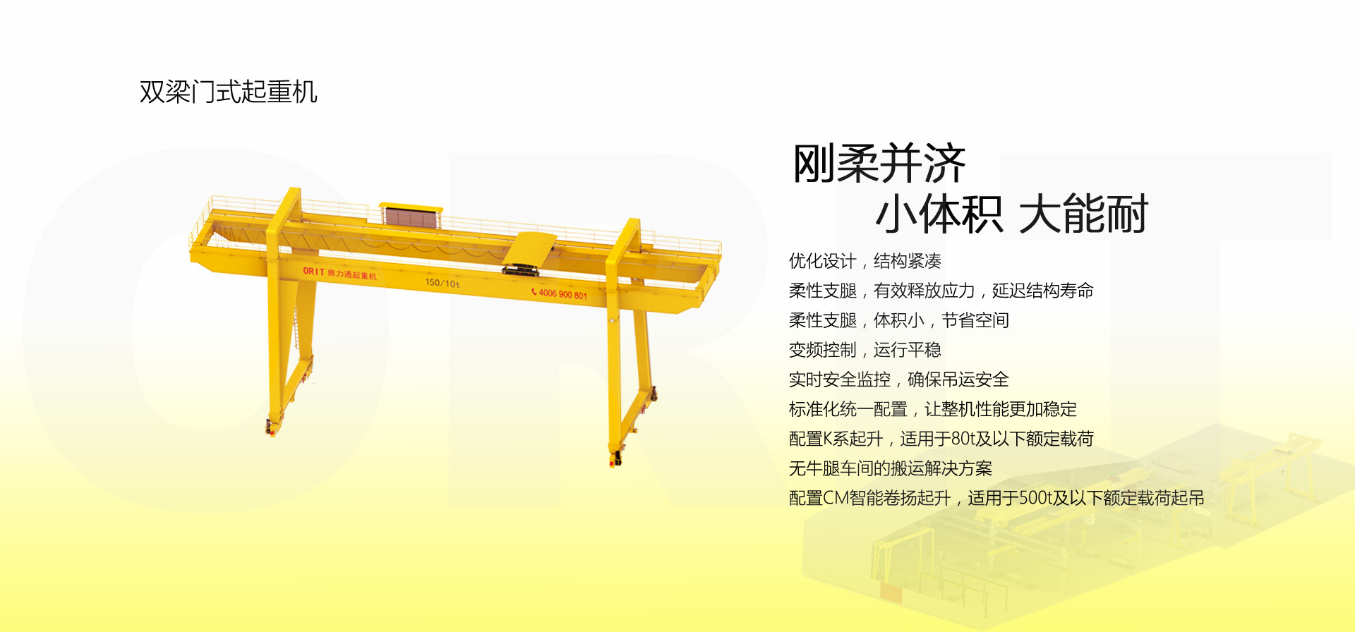 奧力通集起重機(jī)研發(fā)、制造、銷售、安裝、服務(wù)于一體,公司主要生產(chǎn)起重機(jī)、橋式起重機(jī)、門式起重機(jī)、雙梁起重機(jī)、單梁起重機(jī)、歐式雙梁橋式起重機(jī)、歐式單梁橋式起重機(jī)、歐式懸掛起重機(jī)、多支點懸掛起重機(jī)、歐式雙梁門式起重機(jī)、歐式單梁門式起重機(jī)、歐式半門吊、歐式壁行吊、歐式懸臂吊、歐式輕型起重機(jī)等通用標(biāo)準(zhǔn)起重機(jī),以及全自動智能化起重機(jī)、冶金類起重機(jī)、防爆類起重機(jī)、航空專用起重機(jī)、核電站專用起重機(jī)、造紙專用起重機(jī)、電廠起重機(jī)等特殊專用起重機(jī)。